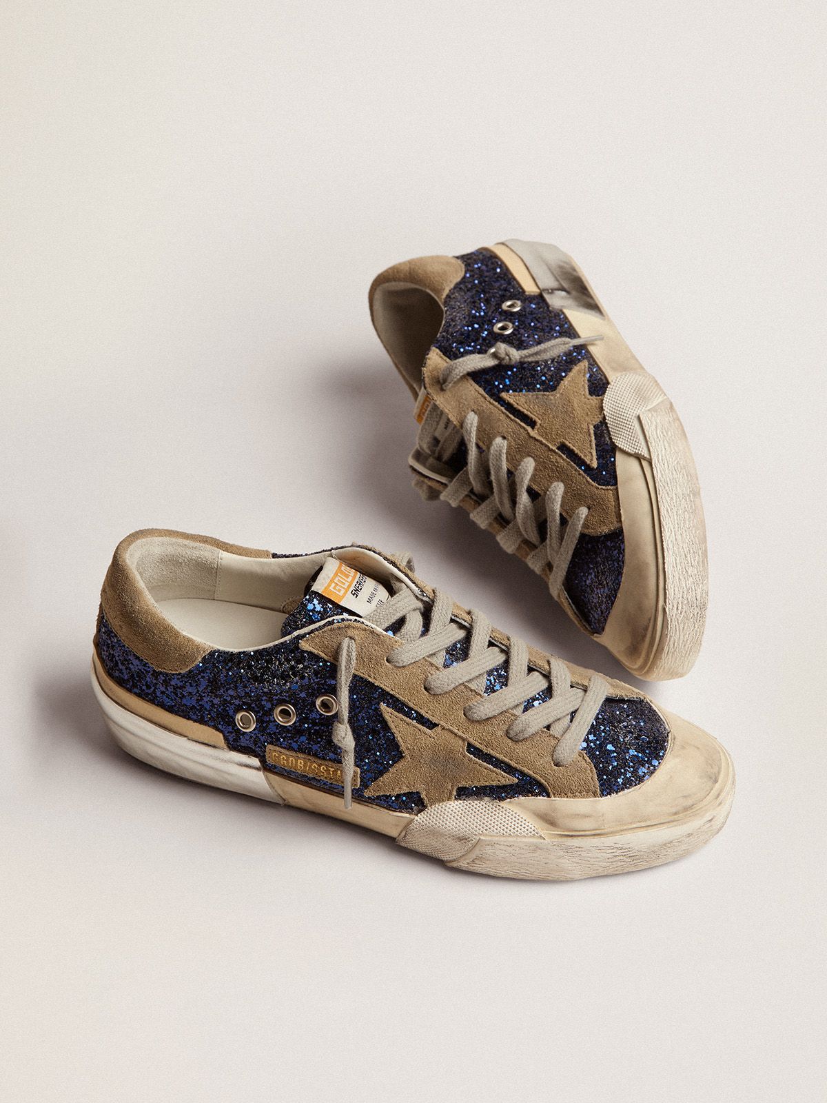 A timeless icon yet one that's constantly evolving. At Golden. we love taking our classics and reworking them all the time. always from a new angle. These Super-Star sneakers feature unexpected details: the blue glitter upper is embellished with a dove-gray suede star. heel tab and inserts. while the foxing is multiple. This is a complex artisan technique comprising the addition of various textures and shades of foxing: in smooth platinum-colored leather and beige hammered leather.