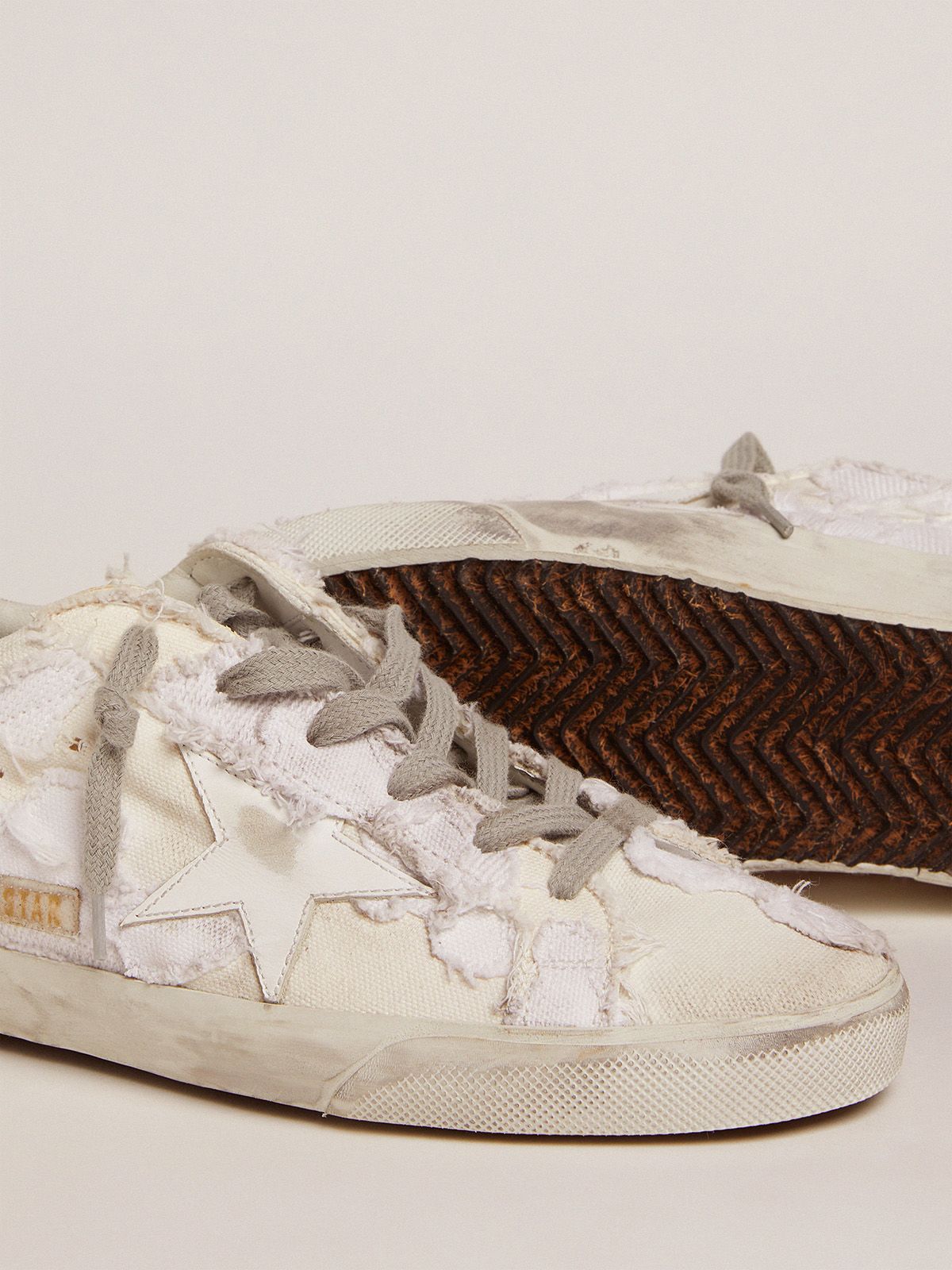 A timeless icon yet one that's constantly evolving. At Golden. we love taking our classics and reworking them all the time. always from a new angle. This time the focus is on sustainability. This Super-Star model features an upper made from a patchwork of canvas offcuts. giving a 3D effect. The lining is made of recycled cotton canvas and the tread is in recycled rubber and coir. a material also used for the insole. The black Swarovski crystal heel tab adds the finishing touch.